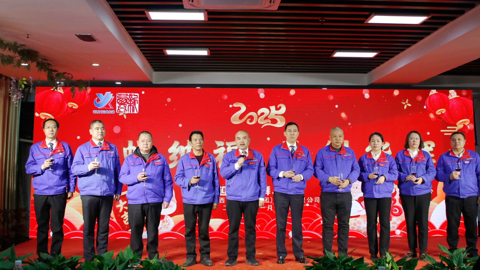 在新春團拜會宴會上,集團公司總經理劉斌攜全體股東、經營班子登臺,共邀在場的來賓及員工舉杯同慶。